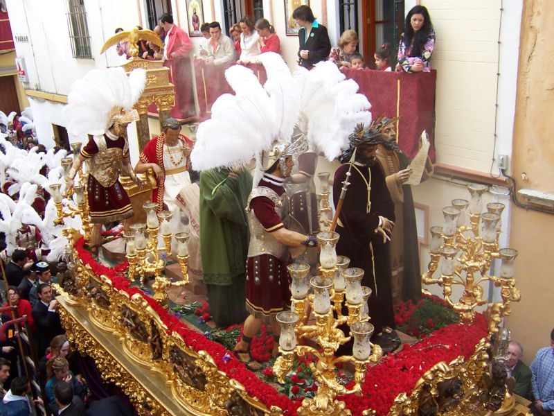 devuélveme al ensueño... a la luz de las farolas sobre las blancas medianeras de mi primera madrugá... dónde fue aquello, jamás lo sabré... entre Feria y San Luis, una plaza, quizá un solar... mi padre nos llevó de la mano, a contracorriente, abecé y primera lección... corta la espera, la justa para abrocharse el último botón de la rebeca... y por la izquierda irrumpió tremendo el paso nunca visto, muchas figuras y tres romanos con plumorras... un sayón pregonero lee y Pilato lo escucha sentado, casi apoltronado, con la tensión baja, dos horas de pregón, agüita en palangana por favor... tres columnas de mármol de veta roja sustentan el SPQR con el águila imperial dorada posada sobre el orbe... un trono es como un caballo o un olivo, seña de indentidad de paso grande de misterio... qué lee el judío en el pregamino reliao, pregunto a mi padre... la sentencia a muerte de Jesús... toma ya... la Sentencia...